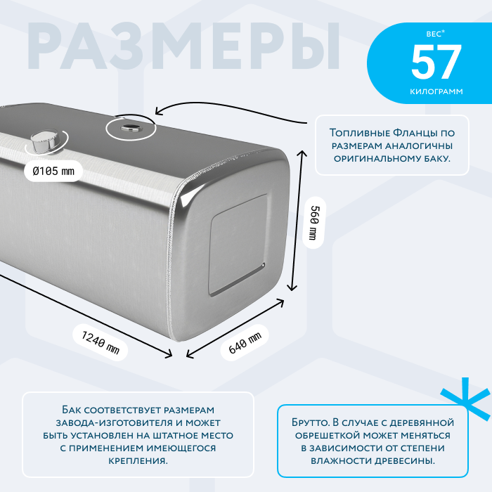 - Так же, если вы приобретаете алюминиевый топливный бак, он будет в деревянной обрешетке (для усиления защиты при транспортировке). При просчете веса и объема, цена за доставку может измениться по факту взвешивания на самом терминале транспортной компании. Так как деревянная обрешетка соответственно изготовлена из древесины, и она имеет свойство значительно набирать вес в зависимости от влажности окружающей среды.