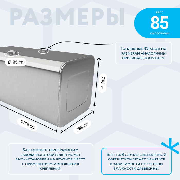 - Так же, если вы приобретаете алюминиевый топливный бак, он будет в деревянной обрешетке (для усиления защиты при транспортировке). При просчете веса и объема, цена за доставку может измениться по факту взвешивания на самом терминале транспортной компании. Так как деревянная обрешетка соответственно изготовлена из древесины, и она имеет свойство значительно набирать вес в зависимости от влажности окружающей среды.
